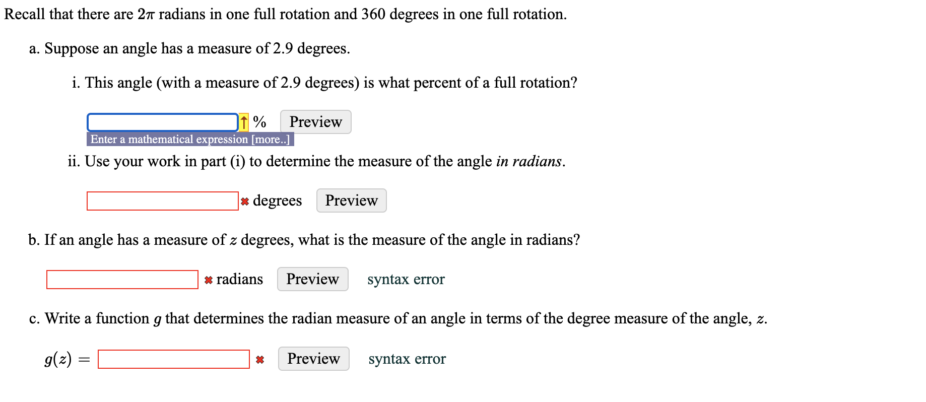 Web Web Free math problem solver answers your algebra geometry trigonometry calculus Find an angle that is positive less than 2 2 and coterminal with Find the Reference Angle. Web Radian to degree calculator mathway - To convert radians to degrees multiply by 180 180 since a full circle is 360 360 or 2 2 radians. Web radians degrees π 180 Example Convert 30 degrees angle to radians.